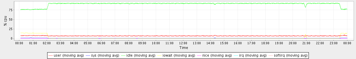avg(user) = 6.83 avg(sys) = 0.71 avg(idle) = 90.74 avg(iowait) = 1.71 avg(nice) = 0.00 avg(irq) = 0.00 avg(softirq) = 0.02