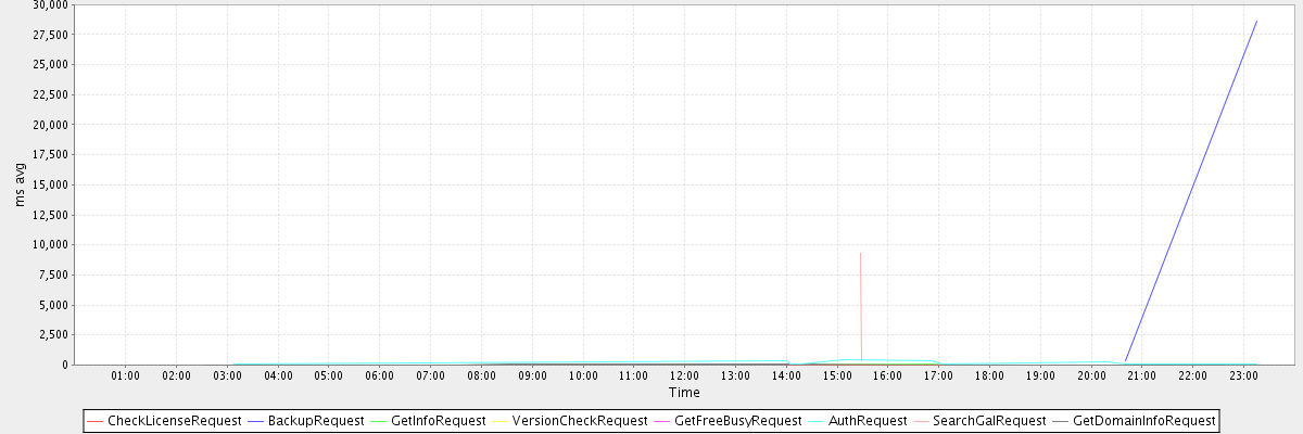avg(CheckLicenseRequest) = 1.50 avg(BackupRequest) = 14489.00 avg(GetInfoRequest) = 13.67 avg(VersionCheckRequest) = 275.00 avg(GetFreeBusyRequest) = 4931.00 avg(AuthRequest) = 176.36 avg(SearchGalRequest) = 4834.00 avg(GetDomainInfoRequest) = 6.08