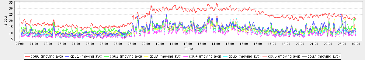 avg(cpu0) = 22.97 avg(cpu1) = 13.17 avg(cpu2) = 13.36 avg(cpu3) = 12.36 avg(cpu4) = 9.73 avg(cpu5) = 11.23 avg(cpu6) = 12.80 avg(cpu7) = 11.08
