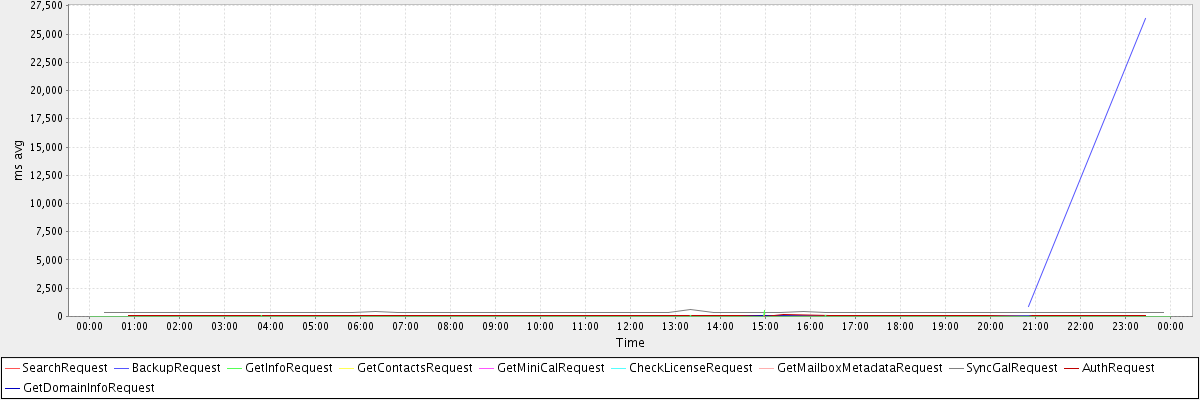 avg(SearchRequest) = 31.00 avg(BackupRequest) = 13604.50 avg(GetInfoRequest) = 2.19 avg(GetContactsRequest) = 103.00 avg(GetMiniCalRequest) = 12.00 avg(CheckLicenseRequest) = 1.05 avg(GetMailboxMetadataRequest) = 1.00 avg(SyncGalRequest) = 372.79 avg(AuthRequest) = 67.33 avg(GetDomainInfoRequest) = 4.21