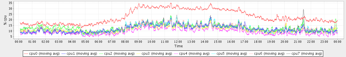 avg(cpu0) = 22.88 avg(cpu1) = 11.87 avg(cpu2) = 13.02 avg(cpu3) = 11.52 avg(cpu4) = 9.56 avg(cpu5) = 12.13 avg(cpu6) = 12.59 avg(cpu7) = 12.26