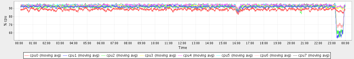 avg(cpu0) = 88.66 avg(cpu1) = 91.19 avg(cpu2) = 91.15 avg(cpu3) = 92.30 avg(cpu4) = 93.69 avg(cpu5) = 93.76 avg(cpu6) = 93.28 avg(cpu7) = 93.78