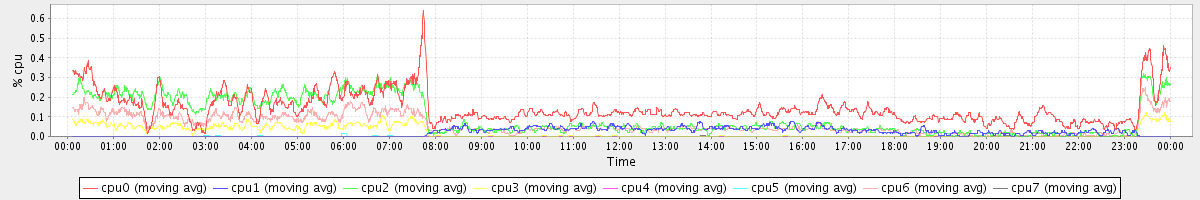 avg(cpu0) = 1.41 avg(cpu1) = 0.19 avg(cpu2) = 0.28 avg(cpu3) = 0.15 avg(cpu4) = 0.09 avg(cpu5) = 0.13 avg(cpu6) = 0.18 avg(cpu7) = 0.10
