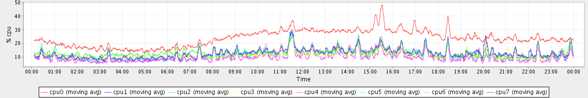 avg(cpu0) = 23.81 avg(cpu1) = 12.81 avg(cpu2) = 13.02 avg(cpu3) = 11.75 avg(cpu4) = 9.62 avg(cpu5) = 11.65 avg(cpu6) = 12.89 avg(cpu7) = 11.55
