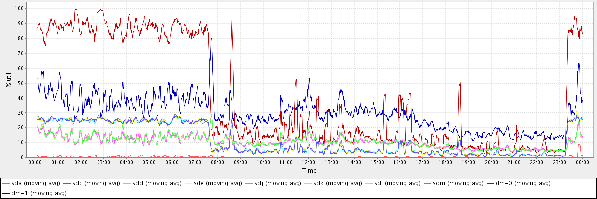 avg(sda) = 0.38 avg(sdc) = 11.31 avg(sdd) = 10.63 avg(sde) = 11.25 avg(sdj) = 10.53 avg(sdk) = 11.31 avg(sdl) = 10.65 avg(sdm) = 11.27 avg(dm-0) = 40.09 avg(dm-1) = 30.08