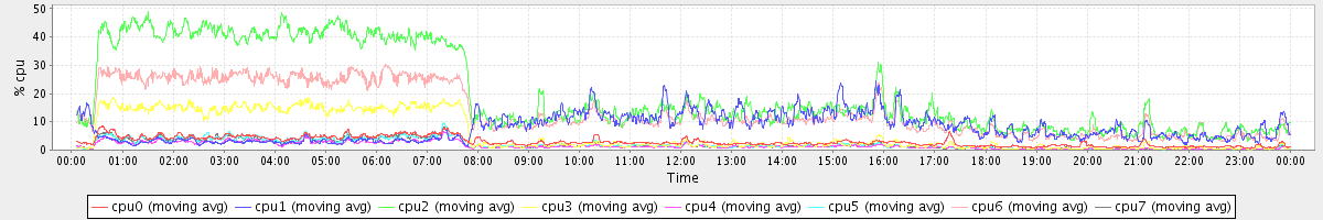 avg(cpu0) = 1.73 avg(cpu1) = 0.26 avg(cpu2) = 0.35 avg(cpu3) = 0.25 avg(cpu4) = 0.21 avg(cpu5) = 0.21 avg(cpu6) = 0.28 avg(cpu7) = 0.19