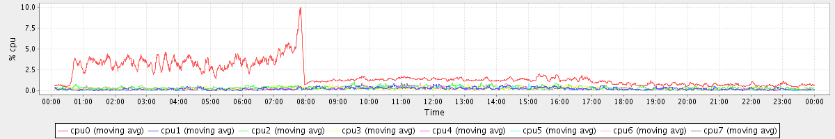 avg(cpu0) = 1.82 avg(cpu1) = 0.23 avg(cpu2) = 0.34 avg(cpu3) = 0.22 avg(cpu4) = 0.18 avg(cpu5) = 0.16 avg(cpu6) = 0.25 avg(cpu7) = 0.19