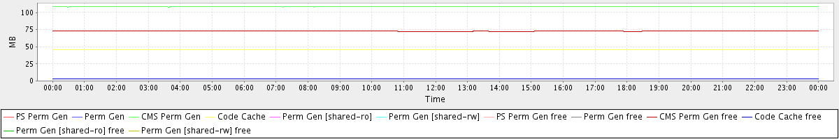avg(PS Perm Gen) = 0.00 avg(Perm Gen) = 0.00 avg(CMS Perm Gen) = 108.43 avg(Code Cache) = 45.18 avg(Perm Gen [shared-ro]) = 0.00 avg(Perm Gen [shared-rw]) = 0.00 avg(PS Perm Gen free) = 0.00 avg(Perm Gen free) = 0.00 avg(CMS Perm Gen free) = 72.76 avg(Code Cache free) = 2.63 avg(Perm Gen [shared-ro] free) = 0.00 avg(Perm Gen [shared-rw] free) = 0.00