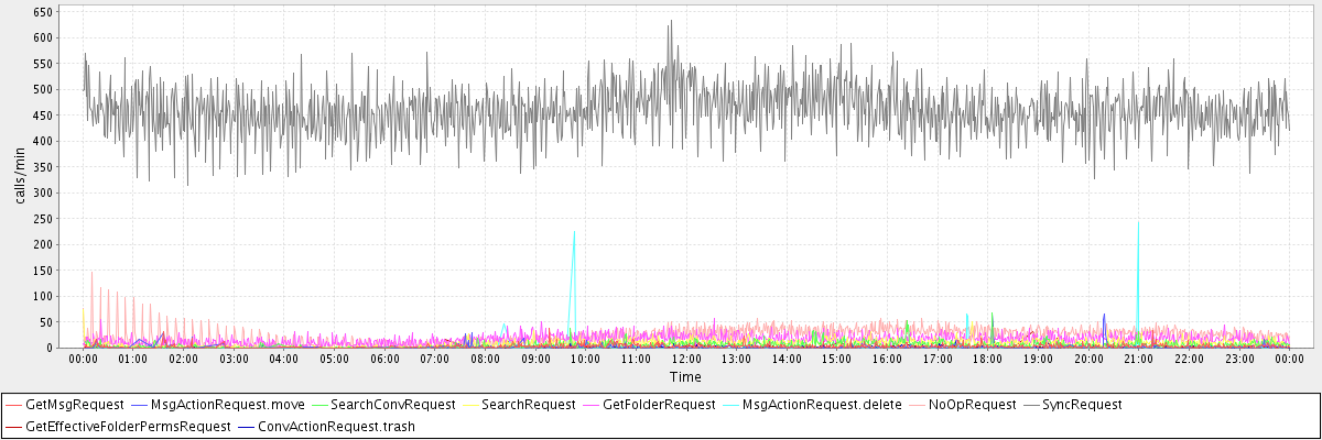 max(GetMsgRequest) = 39.00 max(MsgActionRequest.move) = 65.00 max(SearchConvRequest) = 69.00 max(SearchRequest) = 75.00 max(GetFolderRequest) = 57.00 max(MsgActionRequest.delete) = 242.00 max(NoOpRequest) = 147.00 max(SyncRequest) = 633.00 max(GetEffectiveFolderPermsRequest) = 32.00 max(ConvActionRequest.trash) = 65.00