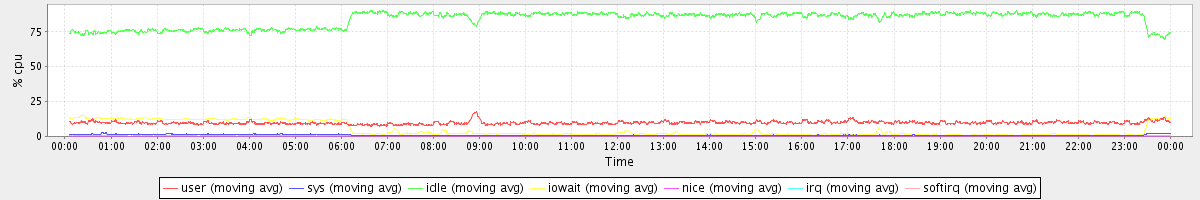 avg(user) = 9.77 avg(sys) = 1.04 avg(idle) = 84.20 avg(iowait) = 4.73 avg(nice) = 0.00 avg(irq) = 0.03 avg(softirq) = 0.25