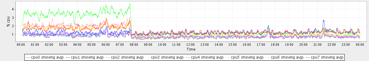 avg(cpu0) = 1.32 avg(cpu1) = 0.12 avg(cpu2) = 0.22 avg(cpu3) = 0.10 avg(cpu4) = 0.07 avg(cpu5) = 0.07 avg(cpu6) = 0.13 avg(cpu7) = 0.07