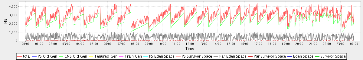 avg(total) = 2962.67 avg(PS Old Gen) = 0.00 avg(CMS Old Gen) = 2389.24 avg(Tenured Gen) = 0.00 avg(Train Gen) = 0.00 avg(PS Eden Space) = 0.00 avg(PS Survivor Space) = 0.00 avg(Par Eden Space) = 483.84 avg(Par Survivor Space) = 89.59 avg(Eden Space) = 0.00 avg(Survivor Space) = 0.00