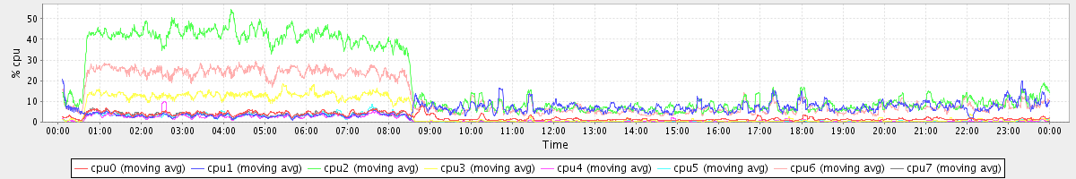 avg(cpu0) = 1.70 avg(cpu1) = 0.17 avg(cpu2) = 0.29 avg(cpu3) = 0.18 avg(cpu4) = 0.16 avg(cpu5) = 0.13 avg(cpu6) = 0.19 avg(cpu7) = 0.15