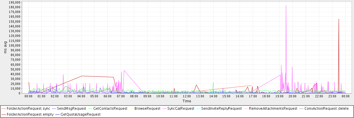 avg(FolderActionRequest.sync) = 10546.00 avg(SendMsgRequest) = 1233.58 avg(GetContactsRequest) = 2517.78 avg(BrowseRequest) = 706.50 avg(SyncGalRequest) = 5924.48 avg(SendInviteReplyRequest) = 1029.33 avg(RemoveAttachmentsRequest) = 730.41 avg(ConvActionRequest.delete) = 1182.21 avg(FolderActionRequest.empty) = 4559.42 avg(GetQuotaUsageRequest) = 1085.00