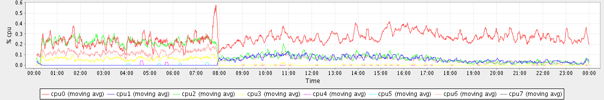 avg(cpu0) = 2.45 avg(cpu1) = 0.44 avg(cpu2) = 0.50 avg(cpu3) = 0.43 avg(cpu4) = 0.30 avg(cpu5) = 0.37 avg(cpu6) = 0.43 avg(cpu7) = 0.37