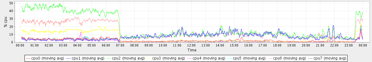 avg(cpu0) = 2.65 avg(cpu1) = 7.24 avg(cpu2) = 19.15 avg(cpu3) = 5.41 avg(cpu4) = 1.36 avg(cpu5) = 1.67 avg(cpu6) = 13.82 avg(cpu7) = 1.74
