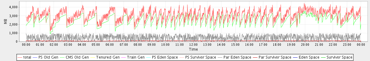 avg(total) = 3088.06 avg(PS Old Gen) = 0.00 avg(CMS Old Gen) = 2508.83 avg(Tenured Gen) = 0.00 avg(Train Gen) = 0.00 avg(PS Eden Space) = 0.00 avg(PS Survivor Space) = 0.00 avg(Par Eden Space) = 491.14 avg(Par Survivor Space) = 88.09 avg(Eden Space) = 0.00 avg(Survivor Space) = 0.00