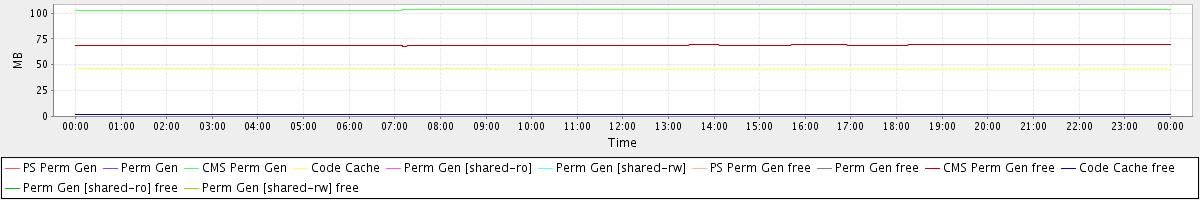 avg(PS Perm Gen) = 0.00 avg(Perm Gen) = 0.00 avg(CMS Perm Gen) = 103.18 avg(Code Cache) = 45.84 avg(Perm Gen [shared-ro]) = 0.00 avg(Perm Gen [shared-rw]) = 0.00 avg(PS Perm Gen free) = 0.00 avg(Perm Gen free) = 0.00 avg(CMS Perm Gen free) = 68.96 avg(Code Cache free) = 2.16 avg(Perm Gen [shared-ro] free) = 0.00 avg(Perm Gen [shared-rw] free) = 0.00