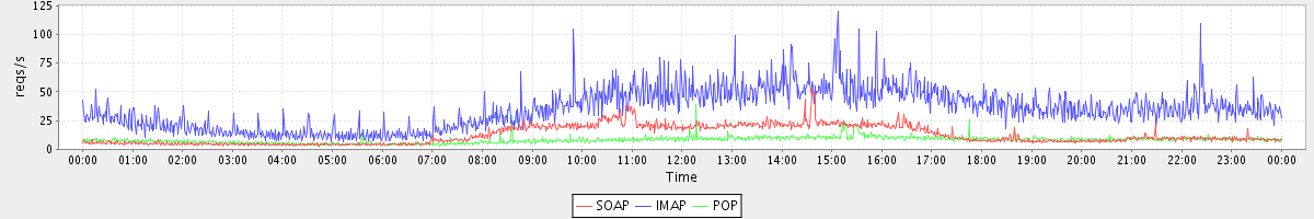 Host zm02.stanford.edu: Mailboxd: Request Rate by Client Protocol