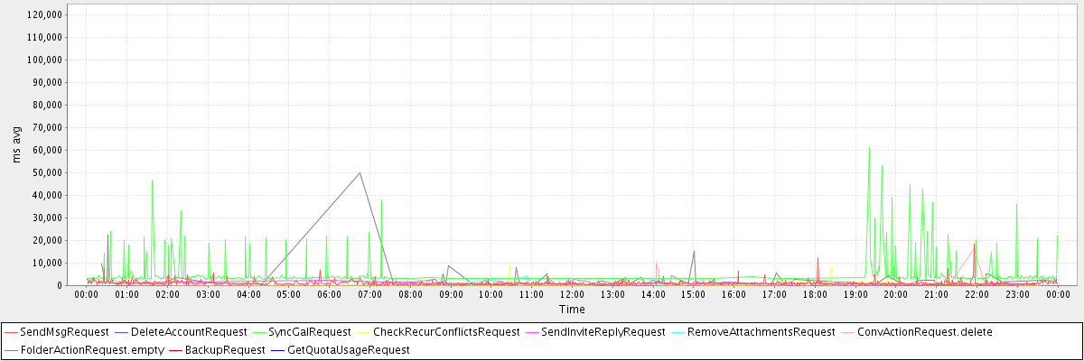avg(SendMsgRequest) = 1048.15 avg(DeleteAccountRequest) = 118959.00 avg(SyncGalRequest) = 5847.47 avg(CheckRecurConflictsRequest) = 1062.33 avg(SendInviteReplyRequest) = 931.10 avg(RemoveAttachmentsRequest) = 1115.40 avg(ConvActionRequest.delete) = 989.78 avg(FolderActionRequest.empty) = 2615.08 avg(BackupRequest) = 758.00 avg(GetQuotaUsageRequest) = 1068.00