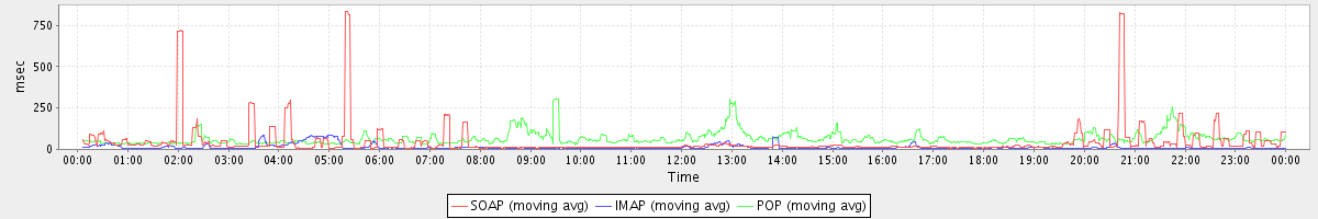 avg(SendMsgRequest) = 1070.65 avg(DeleteAccountRequest) = 12696.75 avg(SyncGalRequest) = 6202.15 avg(CreateAppointmentExceptionRequest) = 840.40 avg(SendInviteReplyRequest) = 955.00 avg(RemoveAttachmentsRequest) = 1632.40 avg(ConvActionRequest.delete) = 924.08 avg(FolderActionRequest.empty) = 3032.30 avg(BackupRequest) = 664.00 avg(GetQuotaUsageRequest) = 1121.00