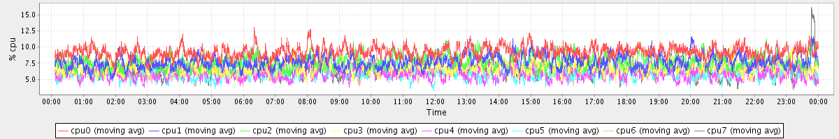 avg(cpu0) = 9.22 avg(cpu1) = 7.69 avg(cpu2) = 7.69 avg(cpu3) = 6.84 avg(cpu4) = 5.81 avg(cpu5) = 5.85 avg(cpu6) = 6.51 avg(cpu7) = 6.34