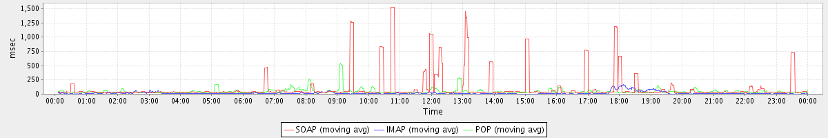 avg(SendMsgRequest) = 825.36 avg(DeleteAccountRequest) = 2604.50 avg(SyncGalRequest) = 3980.59 avg(FolderActionRequest.delete) = 613.40 avg(SendInviteReplyRequest) = 965.00 avg(ConvActionRequest.delete) = 518.19 avg(SearchGalRequest) = 563.30 avg(FolderActionRequest.empty) = 1335.58 avg(BackupRequest) = 735.50 avg(GetQuotaUsageRequest) = 2178.00