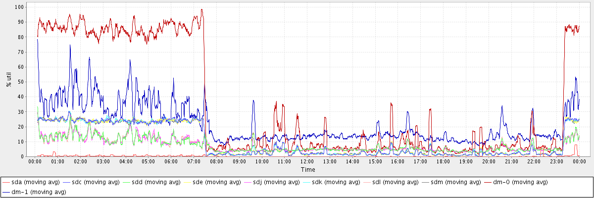 avg(sda) = 0.36 avg(sdc) = 9.74 avg(sdd) = 7.59 avg(sde) = 9.68 avg(sdj) = 7.54 avg(sdk) = 9.75 avg(sdl) = 7.59 avg(sdm) = 9.75 avg(dm-0) = 34.71 avg(dm-1) = 21.81