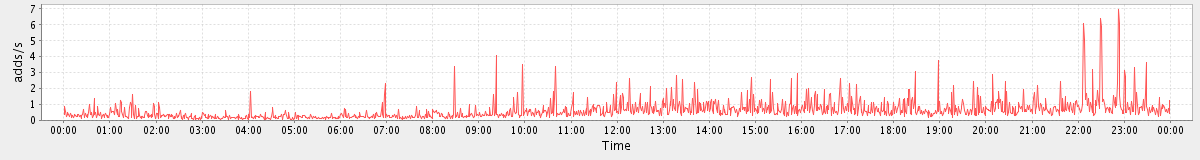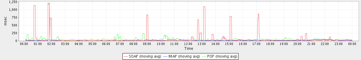 max(GetMsgRequest) = 1033.00 max(MsgActionRequest.move) = 45.00 max(SearchConvRequest) = 52.00 max(SetAppointmentRequest) = 99.00 max(GetFolderRequest) = 81.00 max(SearchRequest) = 117.00 max(ItemActionRequest.delete) = 476.00 max(NoOpRequest) = 161.00 max(SyncRequest) = 236.00 max(GetAppointmentRequest) = 984.00