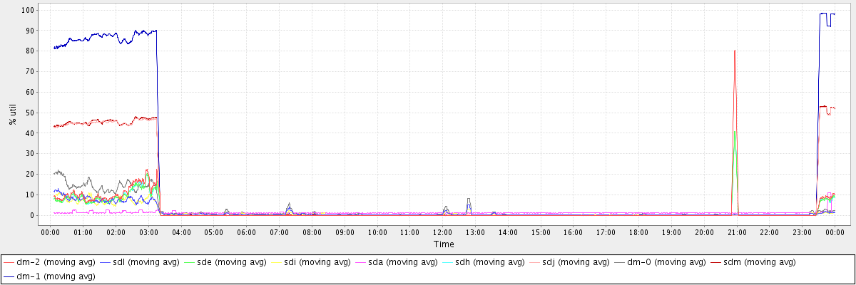 avg(dm-2) = 2.13 avg(sdl) = 1.38 avg(sde) = 1.71 avg(sdi) = 1.30 avg(sda) = 1.27 avg(sdh) = 1.71 avg(sdj) = 7.33 avg(dm-0) = 2.55 avg(sdm) = 7.38 avg(dm-1) = 13.97