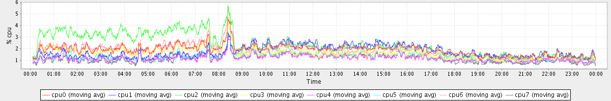 avg(cpu0) = 2.09 avg(cpu1) = 0.38 avg(cpu2) = 0.47 avg(cpu3) = 0.37 avg(cpu4) = 0.28 avg(cpu5) = 0.34 avg(cpu6) = 0.37 avg(cpu7) = 0.33