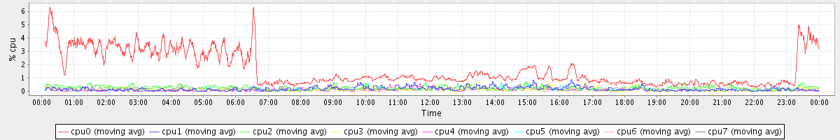 avg(cpu0) = 1.59 avg(cpu1) = 0.18 avg(cpu2) = 0.25 avg(cpu3) = 0.13 avg(cpu4) = 0.09 avg(cpu5) = 0.11 avg(cpu6) = 0.16 avg(cpu7) = 0.08