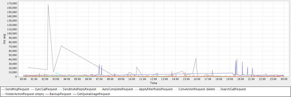 avg(SendMsgRequest) = 974.02 avg(SyncGalRequest) = 4113.54 avg(SendInviteReplyRequest) = 541.83 avg(AutoCompleteRequest) = 544.25 avg(ApplyFilterRulesRequest) = 67070.00 avg(ConvActionRequest.delete) = 697.50 avg(SearchGalRequest) = 655.00 avg(FolderActionRequest.empty) = 10426.09 avg(BackupRequest) = 705.50 avg(GetQuotaUsageRequest) = 1190.00