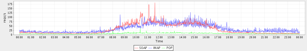 Host zm05.stanford.edu: Mailboxd: Request Rate by Client Protocol
