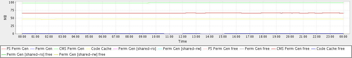 avg(PS Perm Gen) = 0.00 avg(Perm Gen) = 0.00 avg(CMS Perm Gen) = 99.07 avg(Code Cache) = 47.25 avg(Perm Gen [shared-ro]) = 0.00 avg(Perm Gen [shared-rw]) = 0.00 avg(PS Perm Gen free) = 0.00 avg(Perm Gen free) = 0.00 avg(CMS Perm Gen free) = 66.14 avg(Code Cache free) = 0.63 avg(Perm Gen [shared-ro] free) = 0.00 avg(Perm Gen [shared-rw] free) = 0.00