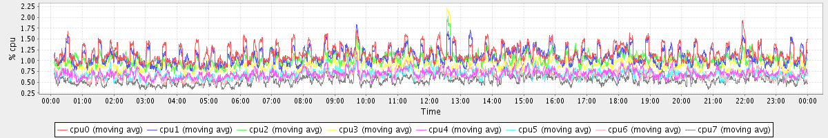 avg(cpu0) = 1.16 avg(cpu1) = 1.10 avg(cpu2) = 1.03 avg(cpu3) = 0.93 avg(cpu4) = 0.70 avg(cpu5) = 0.69 avg(cpu6) = 0.68 avg(cpu7) = 0.55