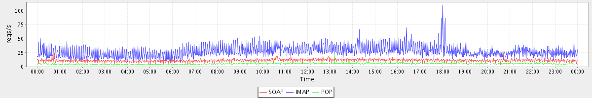 Host zm08.stanford.edu: Mailboxd: Request Rate by Client Protocol