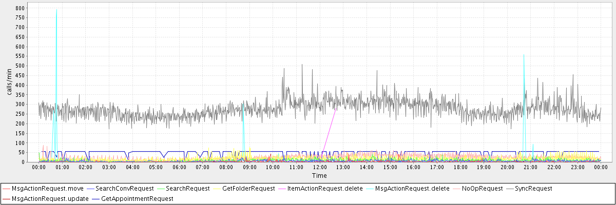 max(MsgActionRequest.move) = 41.00 max(SearchConvRequest) = 37.00 max(SearchRequest) = 49.00 max(GetFolderRequest) = 78.00 max(ItemActionRequest.delete) = 280.00 max(MsgActionRequest.delete) = 792.00 max(NoOpRequest) = 89.00 max(SyncRequest) = 507.00 max(MsgActionRequest.update) = 43.00 max(GetAppointmentRequest) = 57.00