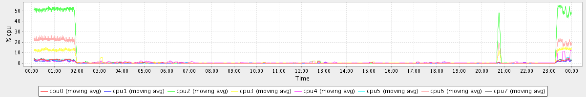 avg(cpu0) = 0.47 avg(cpu1) = 0.28 avg(cpu2) = 5.90 avg(cpu3) = 1.70 avg(cpu4) = 0.90 avg(cpu5) = 0.43 avg(cpu6) = 2.51 avg(cpu7) = 0.51
