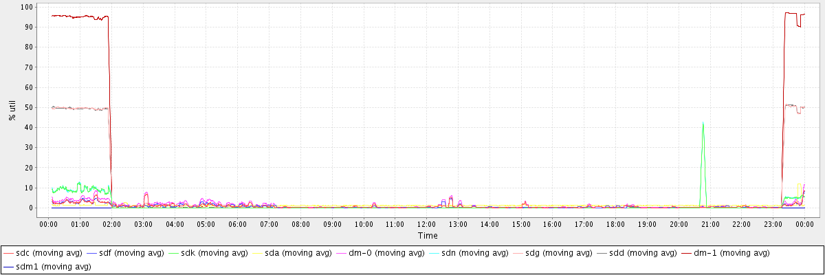 avg(sdc) = 0.78 avg(sdf) = 0.72 avg(sdk) = 1.10 avg(sda) = 1.22 avg(dm-0) = 1.30 avg(sdn) = 1.10 avg(sdg) = 5.47 avg(sdd) = 5.47 avg(dm-1) = 10.50 avg(sdm1) = 0.00