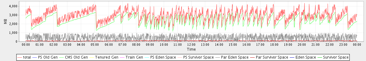 avg(total) = 2976.34 avg(PS Old Gen) = 0.00 avg(CMS Old Gen) = 2414.25 avg(Tenured Gen) = 0.00 avg(Train Gen) = 0.00 avg(PS Eden Space) = 0.00 avg(PS Survivor Space) = 0.00 avg(Par Eden Space) = 475.03 avg(Par Survivor Space) = 87.06 avg(Eden Space) = 0.00 avg(Survivor Space) = 0.00