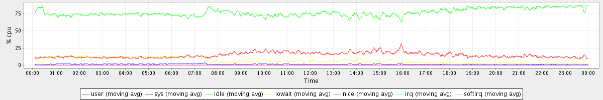 avg(user) = 14.61 avg(sys) = 1.48 avg(idle) = 76.73 avg(iowait) = 6.72 avg(nice) = 0.00 avg(irq) = 0.05 avg(softirq) = 0.41