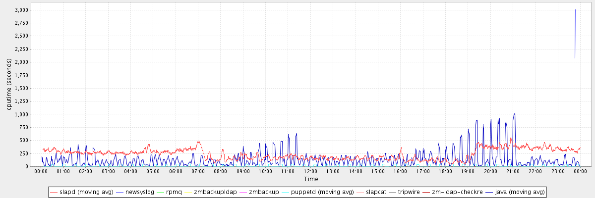 avg(slapd) = 236.82 avg(newsyslog) = 2540.00 avg(rpmq) = 6.00 avg(zmbackupldap) = 5.00 avg(zmbackup) = 5.00 avg(puppetd) = 10.15 avg(slapcat) = 278.00 avg(tripwire) = 3001.00 avg(zm-ldap-checkre) = 5.00 avg(java) = 133.99