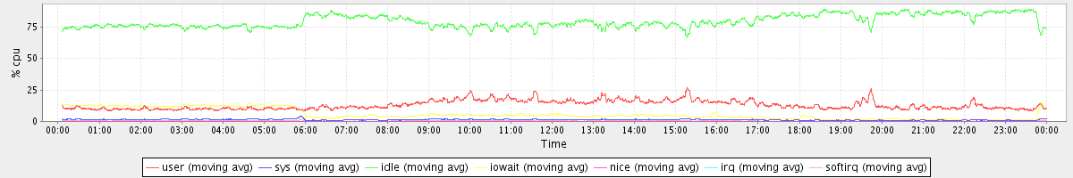 avg(user) = 13.01 avg(sys) = 1.36 avg(idle) = 79.55 avg(iowait) = 5.69 avg(nice) = 0.00 avg(irq) = 0.04 avg(softirq) = 0.35