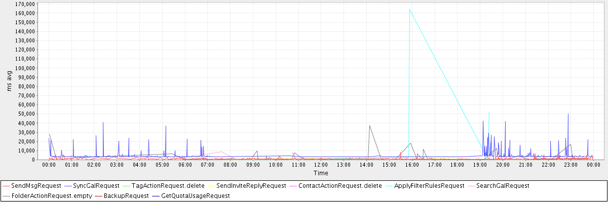 avg(SendMsgRequest) = 856.63 avg(SyncGalRequest) = 4777.17 avg(TagActionRequest.delete) = 2020.00 avg(SendInviteReplyRequest) = 951.38 avg(ContactActionRequest.delete) = 2622.00 avg(ApplyFilterRulesRequest) = 31314.71 avg(SearchGalRequest) = 688.48 avg(FolderActionRequest.empty) = 2833.32 avg(BackupRequest) = 900.00 avg(GetQuotaUsageRequest) = 1058.00