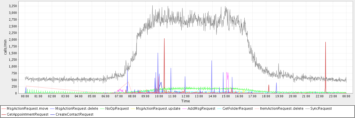 max(MsgActionRequest.move) = 632.00 max(MsgActionRequest.delete) = 1511.00 max(NoOpRequest) = 247.00 max(MsgActionRequest.update) = 147.00 max(AddMsgRequest) = 790.00 max(GetFolderRequest) = 116.00 max(ItemActionRequest.delete) = 424.00 max(SyncRequest) = 3271.00 max(GetAppointmentRequest) = 2049.00 max(CreateContactRequest) = 417.00