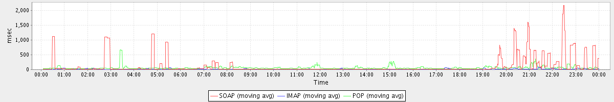 avg(SendMsgRequest) = 937.24 avg(BrowseRequest) = 1190.00 avg(SyncGalRequest) = 5569.99 avg(FolderActionRequest.delete) = 846.25 avg(SendInviteReplyRequest) = 722.60 avg(ApplyFilterRulesRequest) = 5823.80 avg(ConvActionRequest.delete) = 665.47 avg(FolderActionRequest.empty) = 3358.25 avg(BackupRequest) = 1414.00 avg(GetQuotaUsageRequest) = 1190.00
