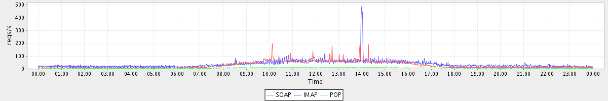 Host zm05.stanford.edu: Mailboxd: Request Rate by Client Protocol