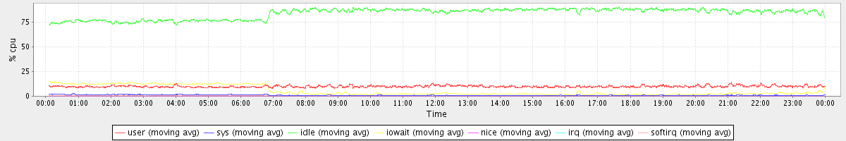 avg(user) = 9.80 avg(sys) = 1.07 avg(idle) = 83.58 avg(iowait) = 5.26 avg(nice) = 0.00 avg(irq) = 0.02 avg(softirq) = 0.28