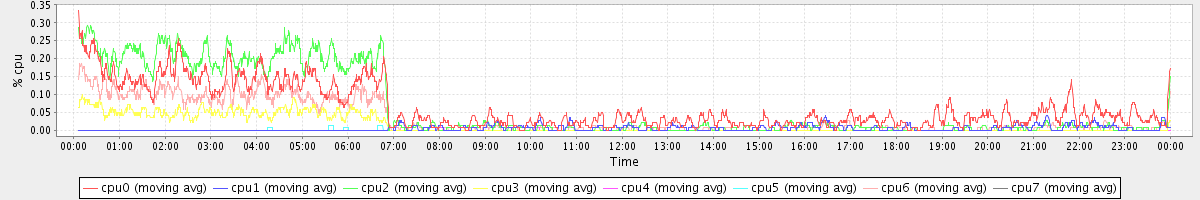 avg(cpu0) = 1.31 avg(cpu1) = 0.12 avg(cpu2) = 0.20 avg(cpu3) = 0.11 avg(cpu4) = 0.06 avg(cpu5) = 0.10 avg(cpu6) = 0.13 avg(cpu7) = 0.09